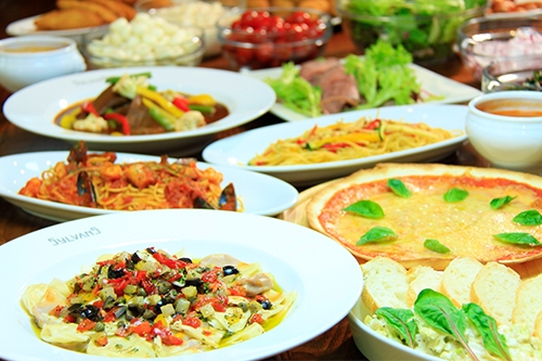 マルゲリータピザ、ミラノ風カツレツ、ペスカトーレ、ニョッキ(ミートソース)、ペペロンチーノ、オッソブーコ、ラヴィオリのラヴィゴット、タリアータ、ミネストローネスープ、マチェドニア、プロフィトロール、チョコレートファウンテンなど