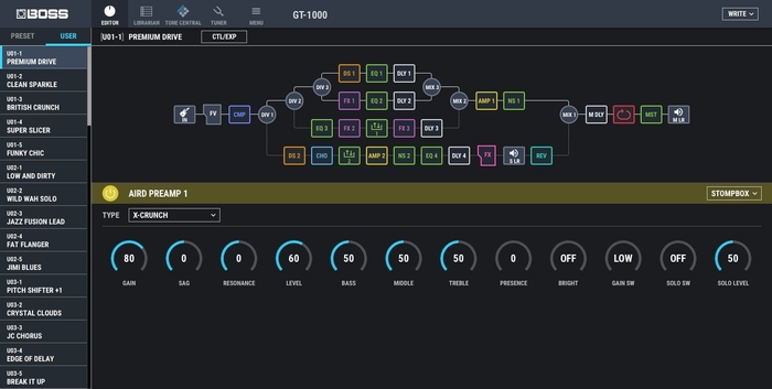 専用アプリ/ソフト「BOSS TONE STUDIO」は、ウェブサイト「BOSS TONE CENTRAL」( http://bosstonecentral.com/ )から無料でダウンロードできます。同サイトにはさまざまなスタイルの音色も用意され、好みの音色を選んで、『GT-1000』で演奏を楽しめます。