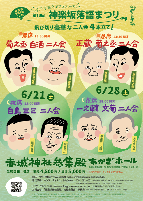 「神楽坂伝統芸能」実行委員会主催、神楽坂伝統芸能2025 第16回『神楽坂落語まつり』が2025年6月21日 (土) ・ 2025年6月28日 (土)にに赤城神社参集殿(あかぎホール)(東京都 新宿区 赤城元町 1-10)にて開催されます。