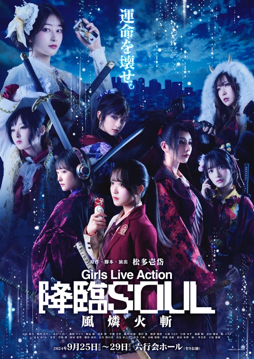 Girls Live Action『降臨SOUL~風燐火斬~』が2024年9月25日 (水) 〜 2024年9月29日 (日)に六行会ホール(東京都 品川区 北品川 2-32-3)にて上演します。この度キービジュアルが公開、日替わりゲストが発表されました。キャストコメントも到着しています。