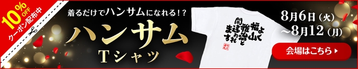 8月6日から先着100注文に、ハンサム語録Tシャツを通常価格より10%オフになるクーポンを配布いたします。この機会に、ご自宅用はもちろん、ギフト用としてもぴったりなオリジナル商品をお求めください。