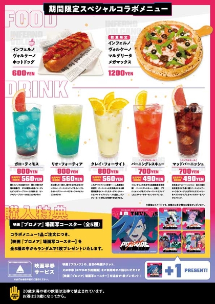 ・来店日当日の映画『プロメア』半券を提示いただくと、上記コラボメニュー1品ご注文時に非売品の場面写コースター(全5種)を、もう1枚プレゼント(通常時1枚→半券提示時2枚)