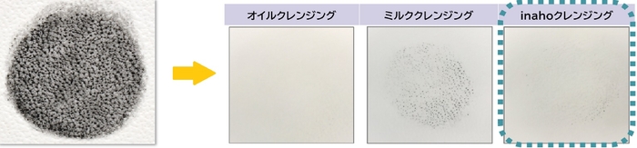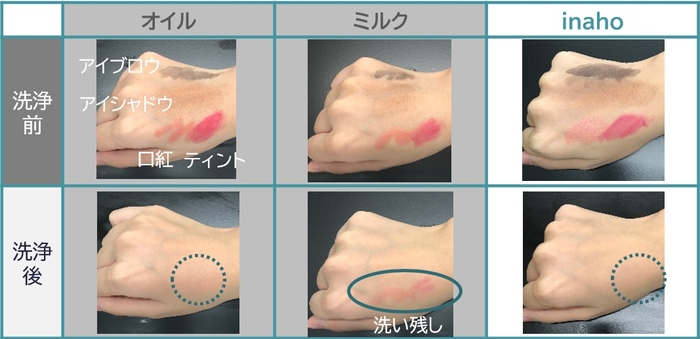 市販品ミネラルオイル系が最も落ちやすいが、天然由来のinahoクレンジングでも乳化させると十分な洗浄力を確認いたしました。