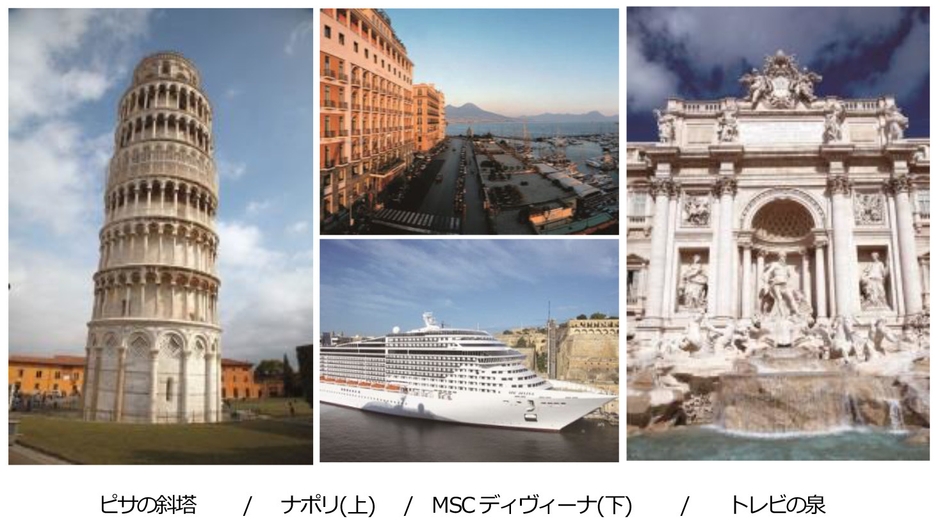 ピサの斜塔(左)/ナポリ(中上) /MSCディヴィーナ(中下) /トレビの泉(右)