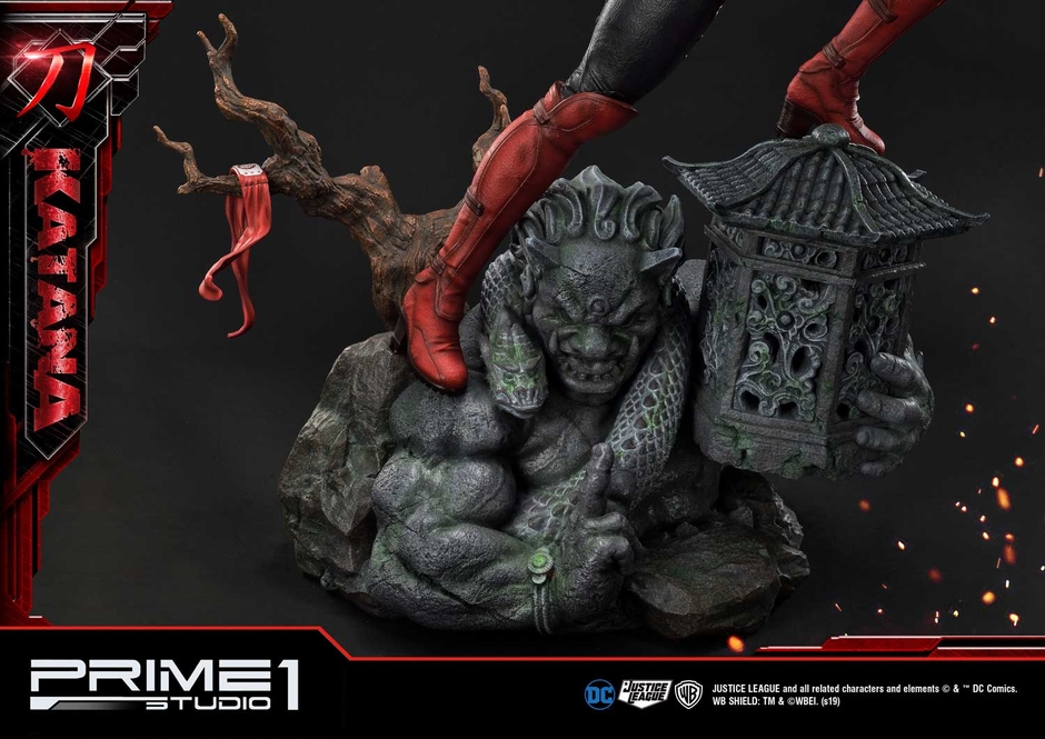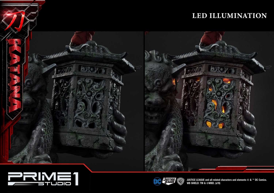 鬼神と灯籠をかたどった石像の迫力に目を奪われる、東洋的意匠でまとめられた台座部分はカタナのキャラクター性を強調、世界観をより一層引き立てます。