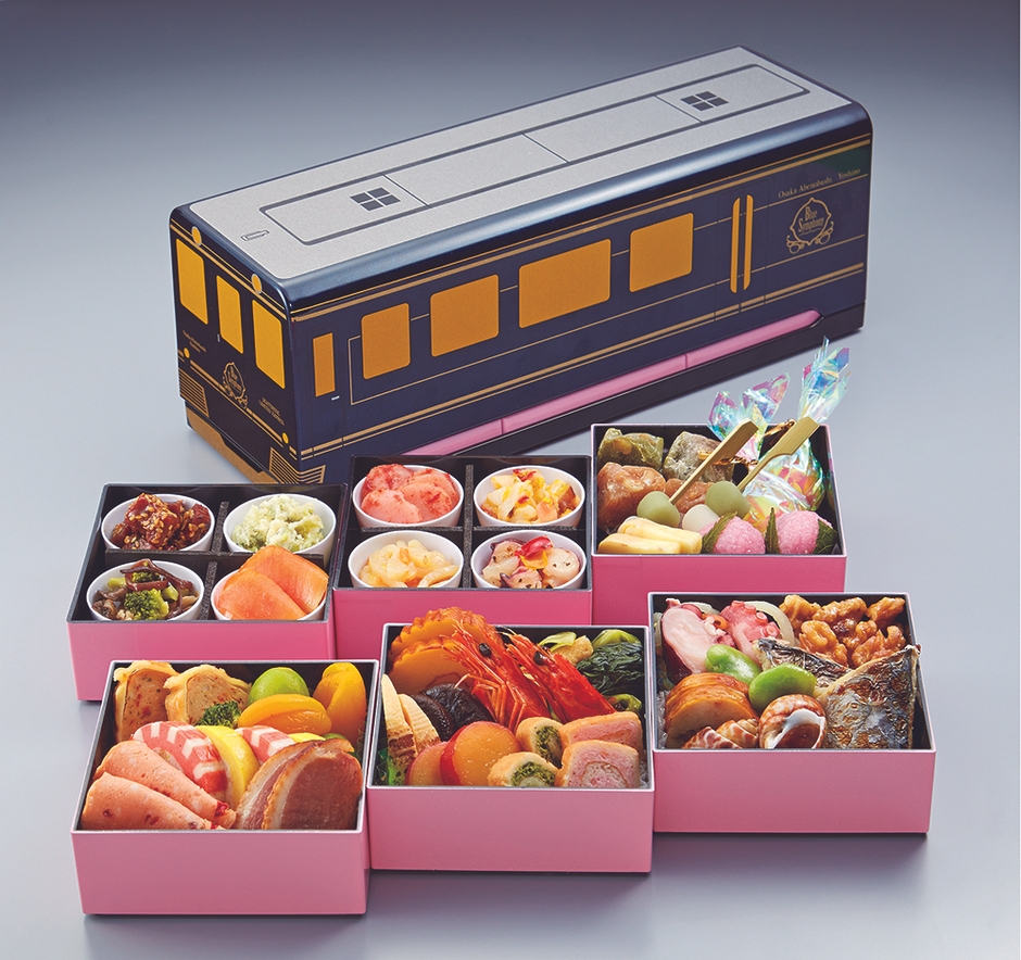 桜の名所吉野へ向かう、近鉄南大阪線・吉野線の観光列車 「青の交響曲(シンフォニー)」をモチーフにした、春らしい桜色の重箱のおせち。和洋の 料理に加え、六の重は桜餅などが入ったスイーツ重です。