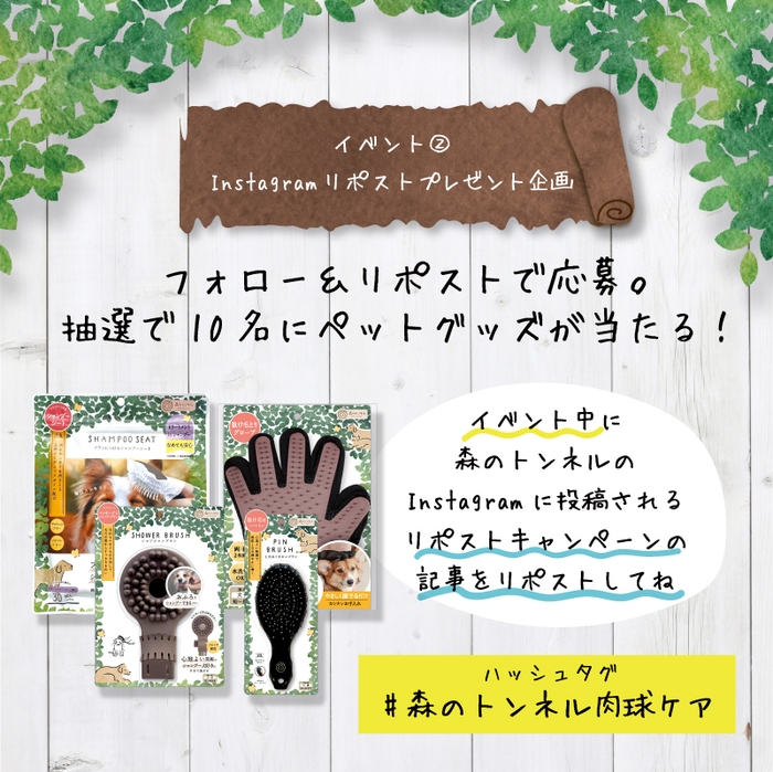 イベント中に 森のトンネルの Instagramに投稿されるリポストキャンペーンの投稿をリポストすることで応募できます。