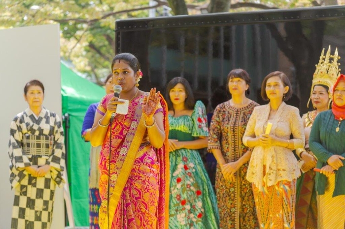 10日にはけやき並木に30店舗以上が立ち並び、また、けやき並木の真ん中に設営された特設ステージでは、府中に在住の外国人の皆さんによる民族衣装紹介から始まり、