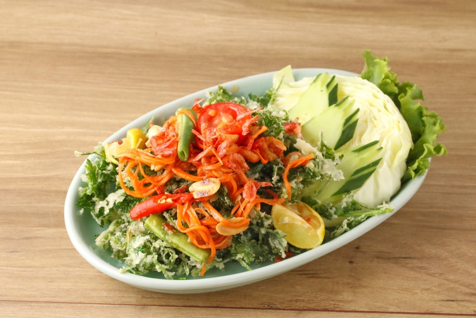 香ばしいパクチーの天ぷらをタイ料理の人気メニューソムタム風に仕上げました。