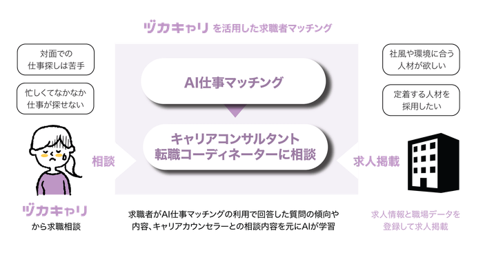 「ヅカキャリ」のAIは、国家資格であるキャリアコンサルタントとして5年以上の経験を有する複数の専門家の暗黙知に基づき、求職者に合った求人情報を探す過程の情報をデータ化し、学習を行っています。