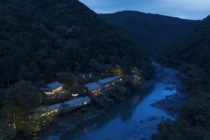 平安貴族が興じた嵐山にたたずむ水辺の私邸で時を忘れる。渡月橋から船に乗り、大堰川を遡った先では、京都に息づく日本の伝統技法を感じる客室、嵐山の情景を映した滋味豊かな日本料理、四季の美しい景観と静けさの非日常が提供されます。