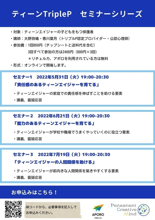 今回のセミナーは、「トリプルP」のティーンエイジャー(中高生)の子どもをもつ親向けのものです。