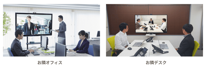 「お隣オフィス・お隣デスク」は、本社と支店・工場など離れたオフィスをオンラインで接続し、オフィスの空間共有を実現できる社内コミュニケーションツールです。