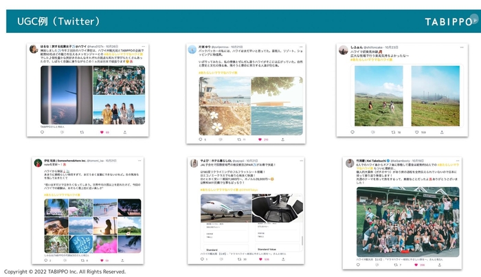 旅を愛するインフルエンサー12名を「マラマハワイウィーク2022・公認メッセンジャー」に任命し、SNSでの情報発信や記事執筆などハワイのメッセージを届ける活動を行っていただきました。その結果、Twitterで1,000件を超える「#あたらしいマラマなハワイ旅」のUGCを創出しました。URL:https://bit.ly/3ftYMOn