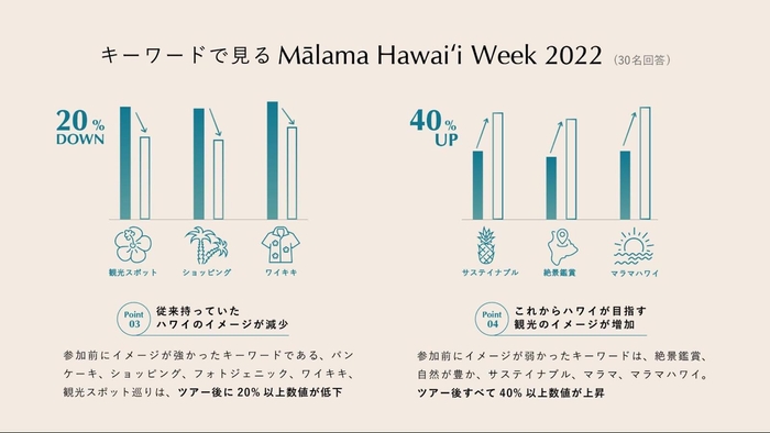 モニターツアー参加前後に実施した意識調査結果によると、マラマハワイに対する理解度・好感度ともにツアー前後で大きく変容し、全ての参加者にとってマラマハワイの印象がポジティブに受け止められたことが分かりました。また、キーワード別に見ても、従来抱いていたハワイのイメージが減少し、これからハワイが目指す観光のイメージが増加しました。