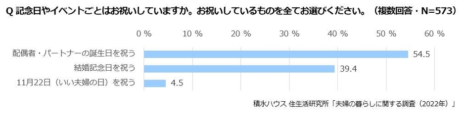 今回の調査では、配偶者やパートナーの誕生日は半数以上、結婚記念日は4割近くの人がお祝いしていると回答しており、夫婦で一緒に記念日を過ごしている人が多いことがわかりました。一方で、「いい夫婦の日」をお祝いしている人は4.5%と、少ない結果になりました。お祝いをする日というイメージを持っている人が少ないのかもしれませんが、せっかくの「いい夫婦の日」、今年からは夫婦のイベントにしてみてはいかがでしょうか。