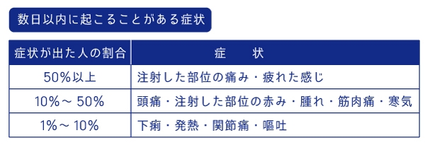 注射を受けたすぐあとよりも、受けた日の夜や次の日に痛みを感じる人が多いようです。