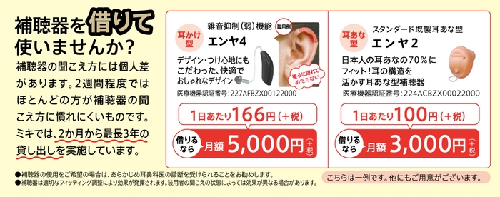 月額3,000円~+税 定額にて補聴器を貸し出し、使えるようになるか不安な方もこれなら安心です。
