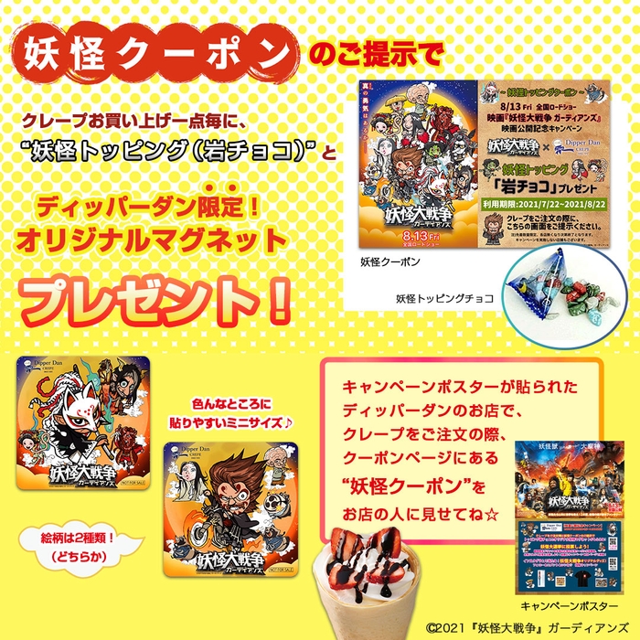 クレープチェーンとして売上日本一(富士経済調べ)の「ディッパーダン」を展開している株式会社オレンジフードコート(本社:東京都江東区、代表取締役:越智 雅也)は、 2021年7月22日(木・祝)より8月13日(金)ロードショーの映画『妖怪大戦争 ガーディアンズ』映画公開記念キャンペーンを開催致します。