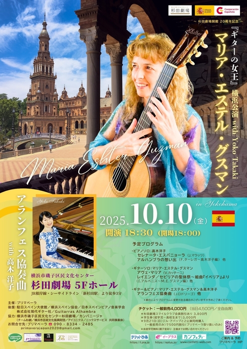 プリマベーラ主催、『ギターの女王』マリア・エステル・グスマン ツアーが2025年10月10日 (金)に横浜市磯子区民文化センター杉田劇場 5Fホール(神奈川県 横浜市磯子区 杉田 1-1-1)にて、2025年10月13日 (月・祝)に大田区民プラザ 小ホール(東京都 大田区 下丸子 三丁目1番3号)にて開催されます。