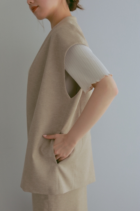 着回し力の高さからも人気のあるジレスタイルを提案。ボタンのないシンプルなデザインが落ち着きのある雰囲気を演出します。ボックスシルエットを採用し、台襟のあるスタンドカラー仕様と合わせて今っぽさを表現しています。また、ポケットにスマホを入れても型崩れしないパターン設計です。スリットの入り方や丈感にこだわったロング丈スカートは、前後2WAYでの着用が可能です。シワになりにくく、自宅の洗濯機で洗える麻調生地が軽やかさを表現しています。