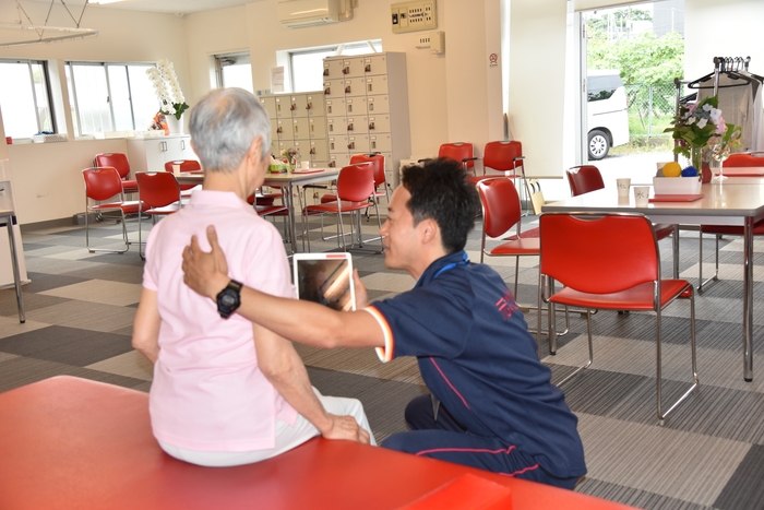 理学療法士が常駐し、利用者の身体の状態や変化をタブレットを用いて画像で伝え、その方に合わせたオーダーメイドの機能訓練を実施します。また、運動指導員と連携して、利用者が住み慣れた地域で自分らしい生活を楽しめるよう、歩く機能を向上させます。
