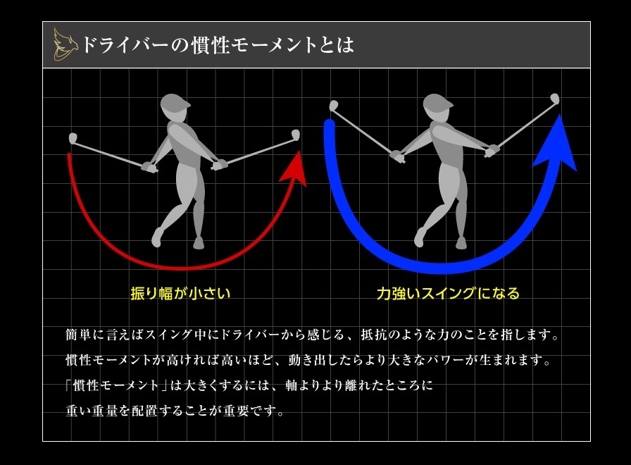 世界基準の特許技術「ステンレスとチタンの直接溶接」によって、最適なポジションで「遠いところにオモリ」を置くことにより、慣性モーメントが大きくて、より「ブレにくく」「パワー(エネルギー)」をボールに効率的に伝えることができるシステムです。