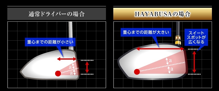 HAYABUSAの特徴2 低重心&深重心にすることにより、一番飛ぶスピン量を実現