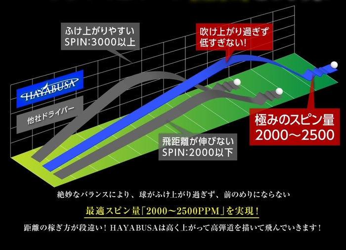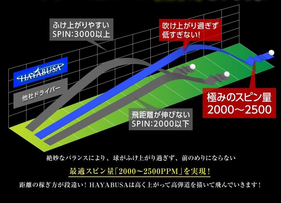 ハヤブサは、最適な低重心&深重心にすることで、ドライバーの最適なスピン量といわれる毎分2000~2500回転(単位/ rpm)を実現しています。この重心の最適化により、ボールが吹きあがりすぎず、高い弾道を打てるようになるのです。