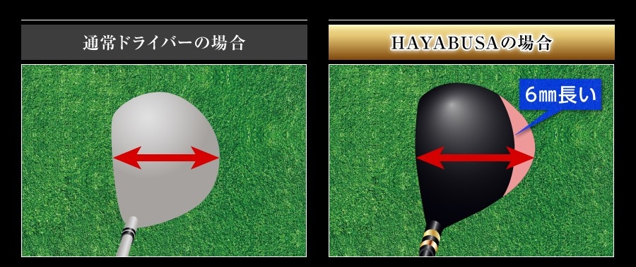 HAYABUSAは、通常のドライバーより、約6㎜長いロングクラウンを採用しています。