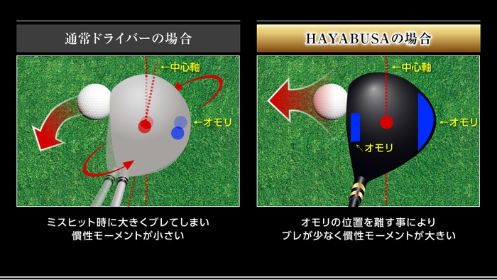 HAYABUSAはドライバーの慣性モーメントを最大化させる「ツインウェイトシステム」を開発。ヘッドの反発力を増幅し、飛ばしのパワーをアップすることに成功しました。