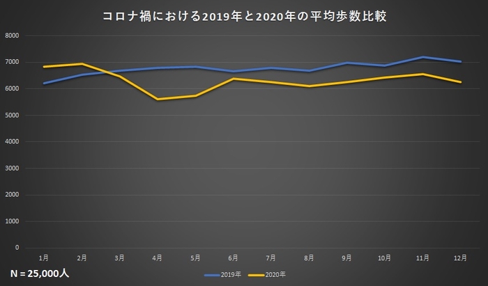 株式会社CUVEYES(東京都中央区)はウォーキングアプリSPOBYの利用者(12万DL)を対象とした年間の歩行量を分析し、新型コロナウイルス流行前の2019年とそれ以降の2020年で、ユーザーの平均歩行量が1日あたり約702歩低下している事を確認しましたのでご報告いたします。
