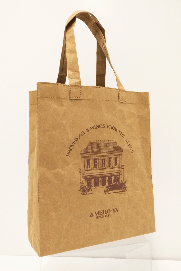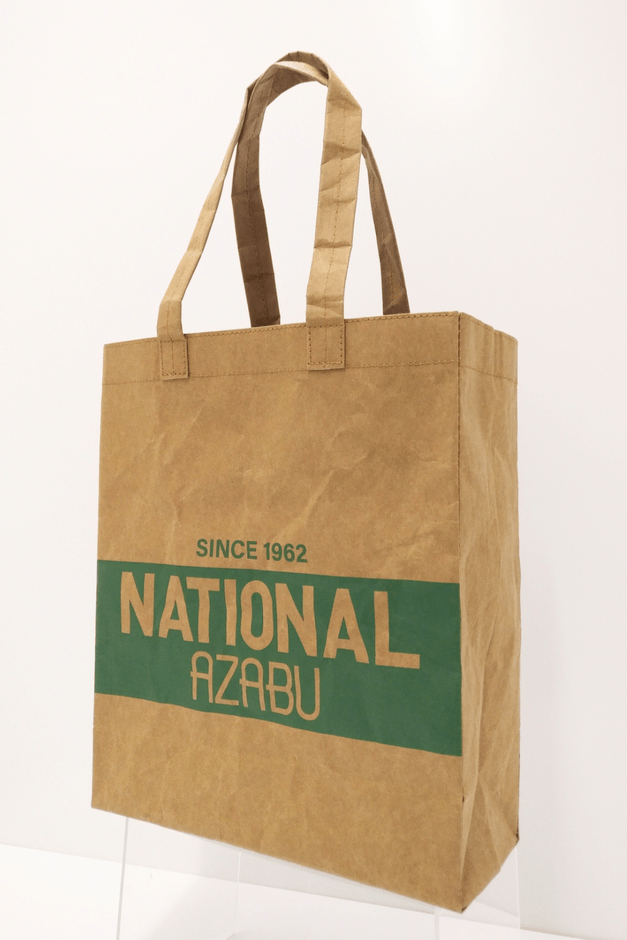 今回は天然由来の素材(天然セルロースパルプ)を主原料に使用した紙袋の風合いで、明治屋ストアーとナショナル麻布のそれぞれのロゴを両面に印刷しましたデザインです。