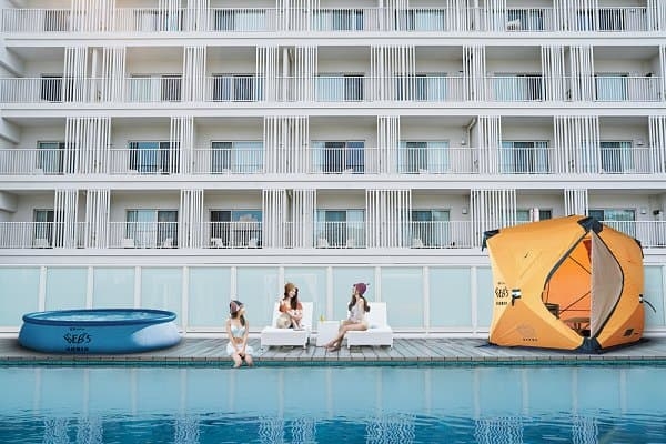 「居酒屋以上 旅未満」の体験を提供する「星野リゾート BEB5(ベブファイブ)沖縄瀬良垣」では、2022年12月24日〜2023年3月31日の期間に、プールとサウナで沖縄の冬を満喫する「ホットナイトプール」が誕生します。施設にある屋外プールが温水化され、冬でもプールを楽しめるようになります。また、ホットプールをより楽しめるよう、夜にはナイトプールとしてオープン!ナイトプールを彩る照明や、より気分を盛り上げるDJブースを設置。さらに、ソファデッキやガゼボでくつろぎながら楽しめるドリンクサービスを提供します。その他にも、プールサイドに設置するテントサウナは予約も料金もフリー!ホットプールで遊びがてら、気軽にととのう体験ができます。チルな気分を盛り上げて、沖縄の冬を満喫できます。