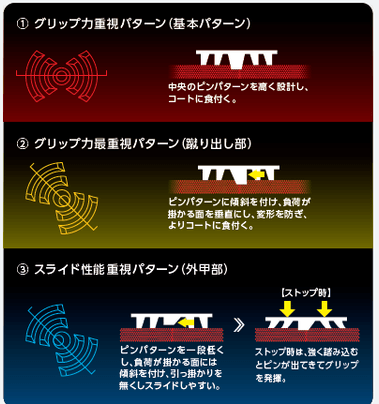 上図②(黄色)は中央のピンパターンの片側に傾斜を付け、もう一方の側をコートに対して垂直に刺さる設計とすることで、蹴り出しで掛かる負荷を垂直面で受け止め、ピンパターンの変形を防ぎ、コートに食付きます。