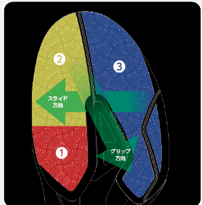 上図①(赤)は中央のピンパターンを他のピンパターンより高く設計し、コートに食付きやすくすることで、グリップ力を向上。