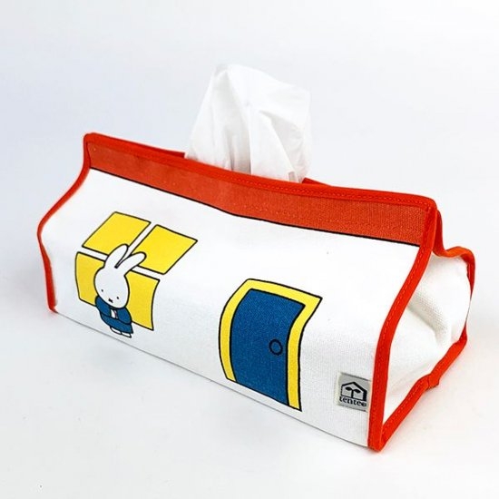 絵本の中のページがそのままデザインされたような、ティッシュカバーです。原色のオレンジやイエローの色使いも、ミッフィーカラーでおなじみですよね。カバーがおうちかのように、窓や玄関のデザインに和みます。