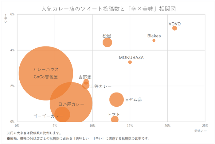 店舗数の多い大型カレーチェーン店よりも個人経営など店舗数の少ないカレー店のほうが投稿数に占める美味しい、辛いといった投稿比率が多くなったことは、お店がそれぞれの特徴を出していることが認知されている結果といえるのではないでしょうか。