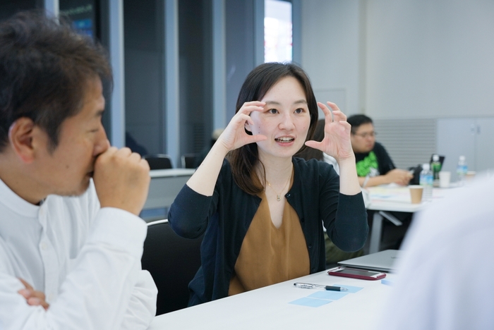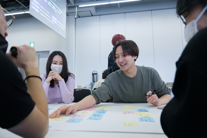 全社員が部署問わずグループに分かれ、チーム一丸となって短時間でプロダクトの社会実装案を考え、提案書に落とし込みます。その後、役員をクライアントに見立て、新機能を提案しました。
