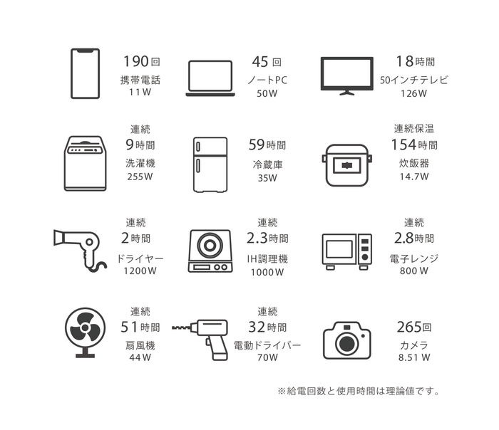 2,000Whクラスのポータブル電源として、業界最小・最軽量レベルのコンパクトさも特徴です。 荷物が多くなりがちなキャンプや車中泊、災害対策用として普段は使わずに収納しておきたい、業務で複数個使う、など、大容量ながら軽量コンパクトであることは、あらゆる場面でユーザーにとって大きなメリットになると考えます。