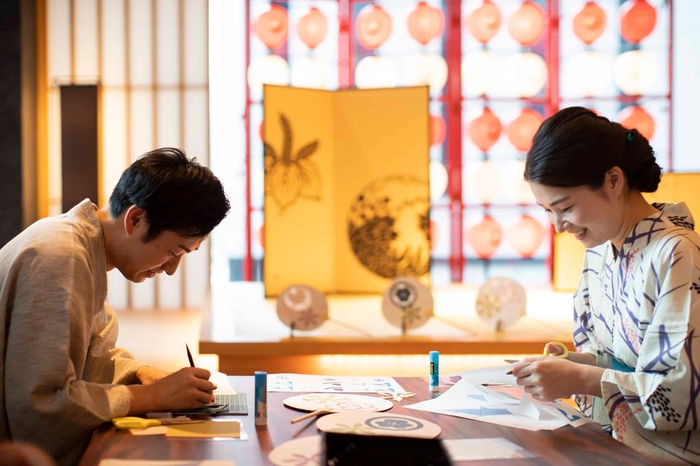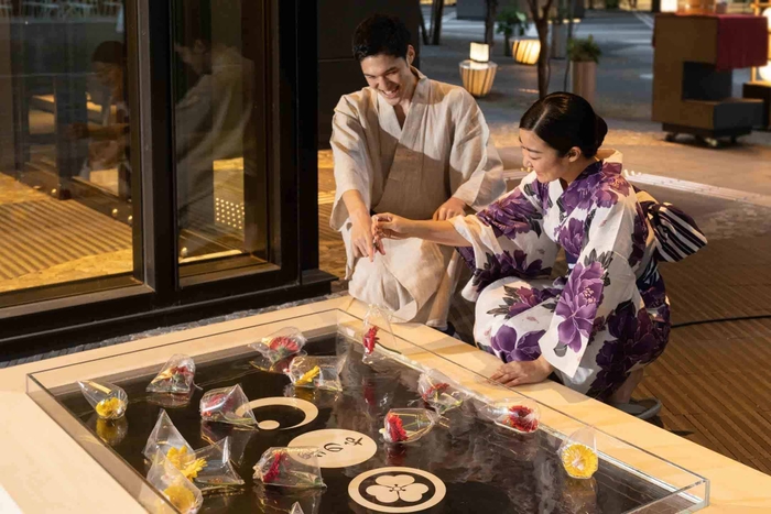 ゆとりある設計のロビーや玄関前の「星のや広場」で、夏祭りの雰囲気と江戸の文化の両方を気軽に体験できる催しです。夕方になると、静かで落ち着いた雰囲気のロビーが、夏祭りのお囃子を思わせる賑やかなBGMを合図に、活気づきます。お祭り気分を楽しみながら、紋切りやお面の絵付け、型抜きといった、江戸時代から現代まで長きにわたって人々に親しまれてきた遊びや、色とりどりの花を釣り針とこよりを使って釣り上げる「お花釣り」が体験できます。