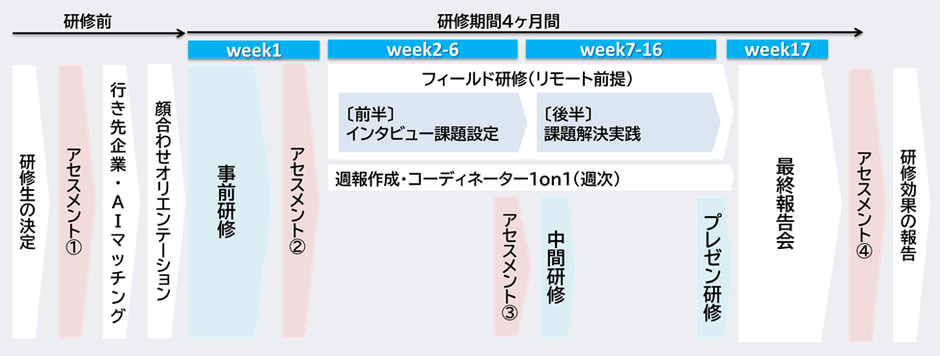 地域越境ビジネス実践プログラムは4ヶ月間の研修プログラムとなります。受講生は10時間程度の座学(実践型スキル習得研修)を受講後、リモート環境下でダブルワーク型フィールド研修(月間30時間×4か月)を通じて、企業課題や地域課題の解決に取り組みます。その際に、次世代リーダーに必須のスキルである生成AIなどのデジタルスキルを駆使して、地域企業におけるビジネスへ実装を行います。