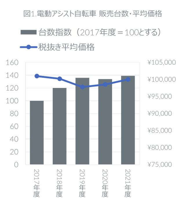 電動アシスト自転車の平均価格は上昇傾向にあり、2021年度の税抜き平均価格は100,001円と前年度から1%上昇した。特にホーム車、ミニサイクルの価格が上昇しており、ホーム車は104,177円と2%、ミニサイクルは92,450円と2%それぞれ前年度から上昇した。その結果、販売金額は前年比5%増と堅調であった。