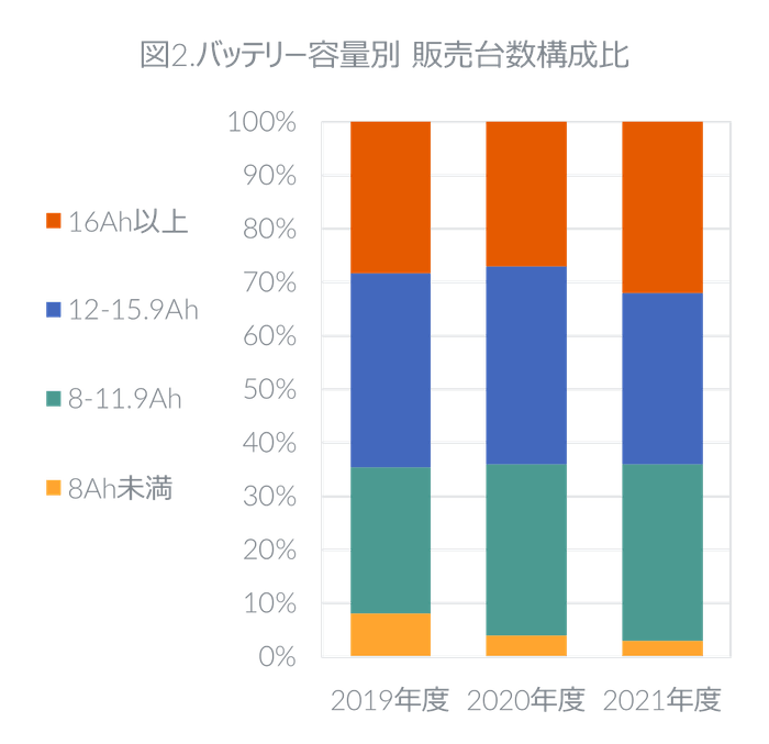 ・16Ah以上のバッテリー容量を搭載した製品の構成比が拡大し、32%を占めた。