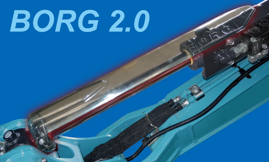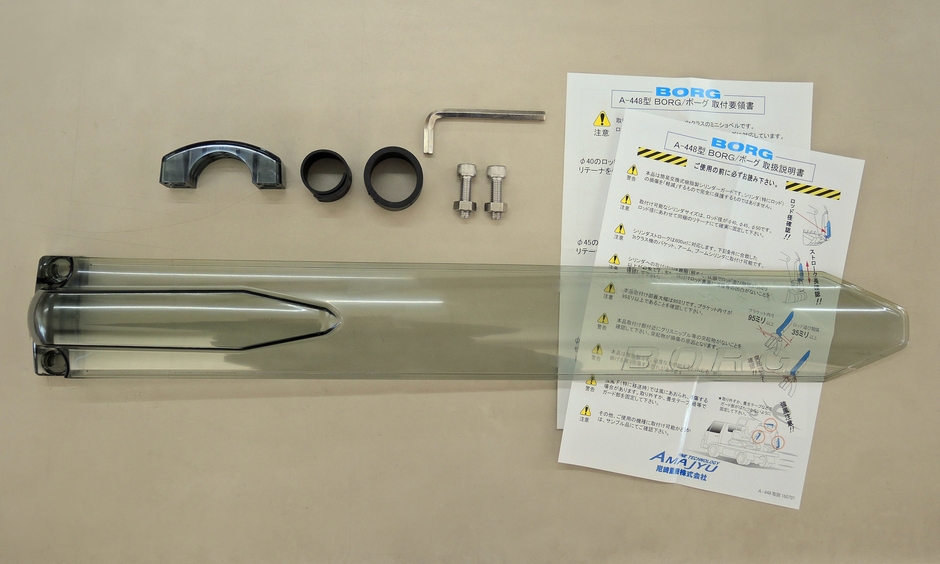樹脂製シリンダーガード「BORG(ボーグ)」は、当社の50年以上にわたる大小様々な油圧ショベルの修理やメンテナンスを通して、現在の工事現場のかかえる問題のひとつにシリンダーガードと、油圧シリンダーの破損があることに着目したことから生まれた特許取得製品です。初期型の「BORG(ボーグ)」による現場実績と、ユーザー様からの多くの意見を取り入れ、素材のHDPE製(高密度ポリエチレン)を改め、ポリカーボネート(PC)を素材として採用し、工事現場や輸送時の耐久性を、初期型と比較し大幅に向上させた新製品が「BORG 2.0(ボーグ2.0)」です。カラーもクリアグレー(半透明色)として高級感をもたせました。「BORG 2.0(ボーグ2.0)」は、初期型の金型に新たな工夫を盛り込み、基本的形状および取り付け方法は同様、大量生産が容易に行え、非常に安価に提供することを可能とし、また極めて軽量かつシンプルにデザインされているため、万一破損した場合でも現場において、作業員1人でボルト、ナット2セットだけで簡単に交換が可能となっています。