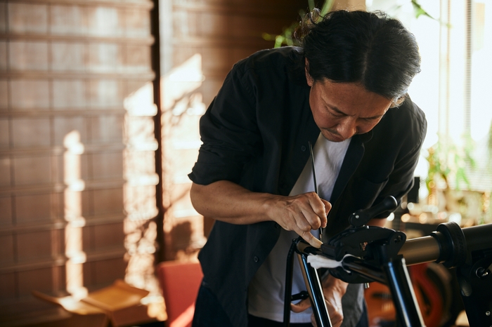 「余計なものを削ぎ落とし、本質を追求した先に生まれる機能美」日本のものづくりにおいてその哲学・美意識は、受け継がれてきました。今改めて、その感性を見つめ直すことで、ものの選び方、ものとの過ごし方が変化し、目に見えないものを大切にする生活に繋がるように。そのような想いを込めフレームビルダー 片岡聖登によって製作された自転車に、漆芸家 服部一齋の漆芸が施されました。ビゴーレで70 年代から受け継がれた設計構造を象徴した螺鈿や蒔絵のデザインは、フレームそのものの構造と一体し、自転車の線の美しさを最大限に際立たせています。