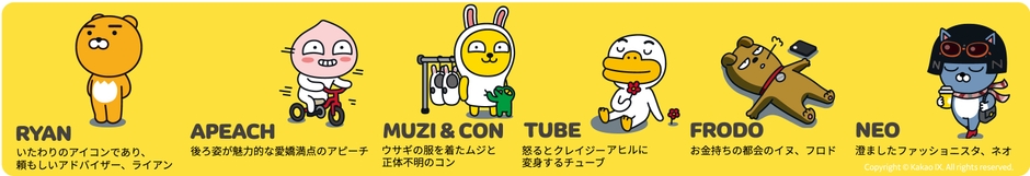 個性と人間的な魅力を持つライアン、ムジ、アピーチ、フロド、ネオ、チューブ、コン、ジェイ・ジーの総勢8人がいます。それぞれに異なる性格を持ち、コンプレックスを1つずつ抱えている8人のキャラクターは、独特でありながらも、私たちの周りでよく見かけるような人々の姿をそのまま反映していることから、さまざまな年齢層から共感され、人気を集めています。