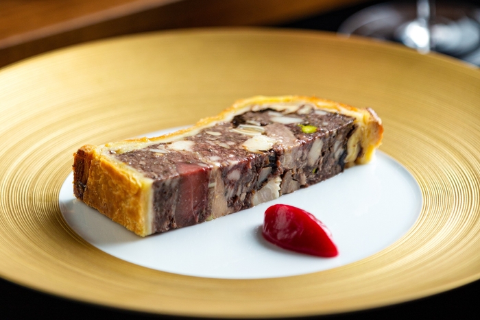 鹿や猪、山鳩、雉など4種類以上のジビエを、トリュフやフォアグラ、フルーツとともに幾層にも積み重ね、パイ生地で包み焼き上げた料理です。ジビエの種類や部位によって、ミンチにしたり、モルソー(塊)にしたりと仕立てを変えています。さらに、すべての肉にちょうど良く火が入るよう、食材を配置し、調理温度を加減しています。