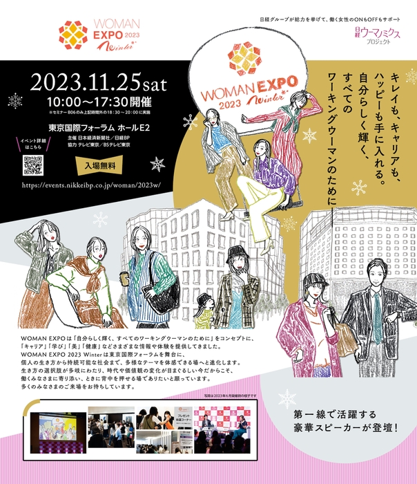 日本経済新聞社と日経BPは、2023年11月25日(土)に東京国際フォーラム(東京都千代田区)にて、働く女性に向けた総合イベント「WOMAN EXPO 2023 Winter」を開催します。