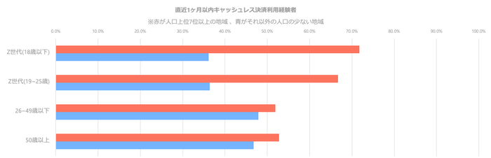 全世代いずれも都市部の方が地方よりもキャッシュレス決済利用経験率が高く、特にZ世代の中でその差は顕著に現れており、都市部では69.3%なのに対し、地方では36.3%と2倍近く多い結果となった。